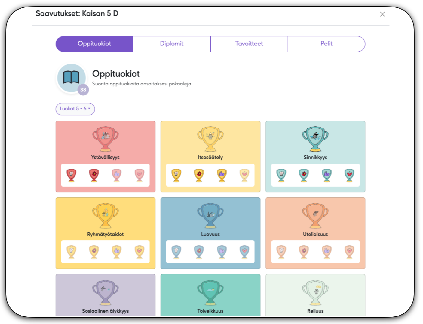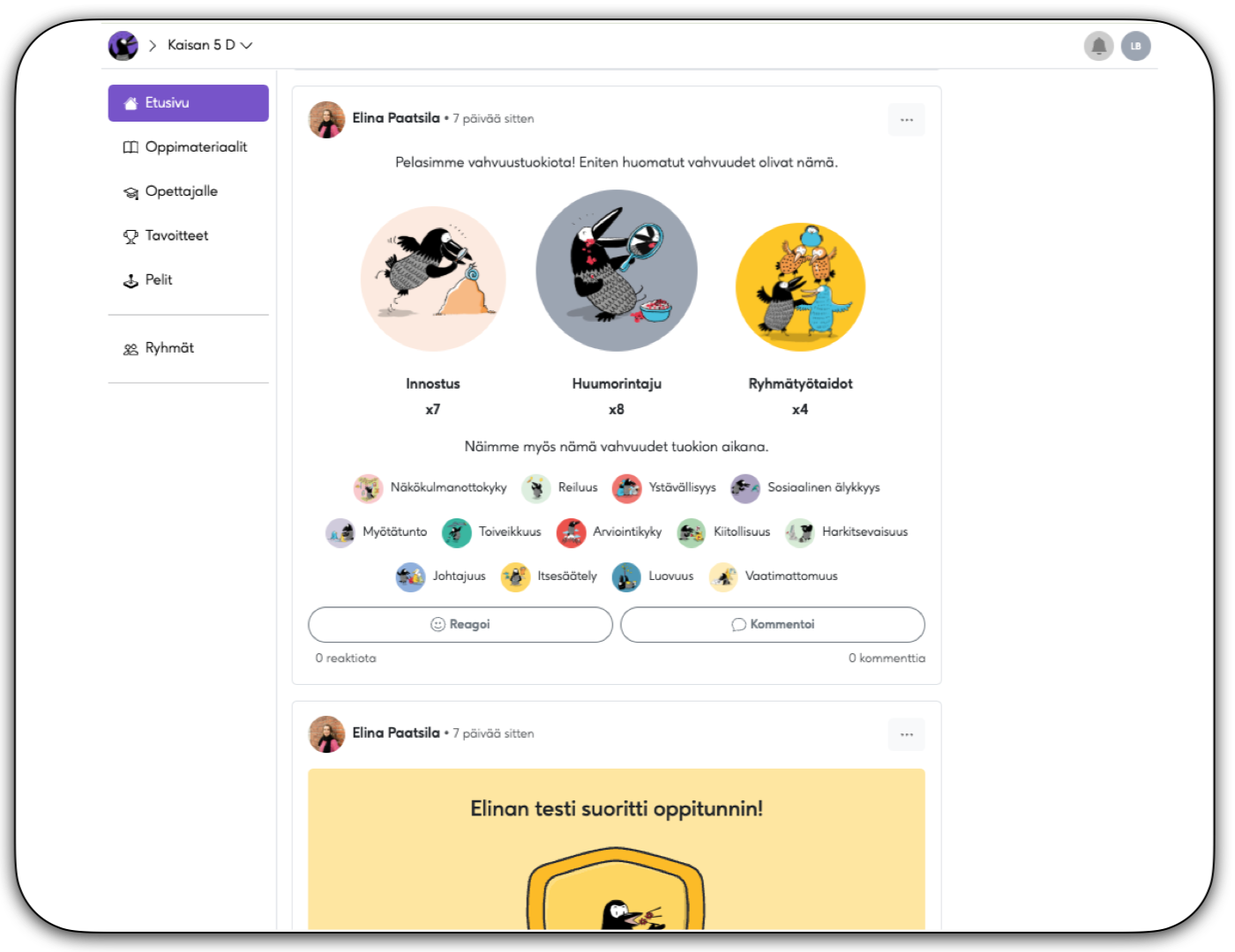 Opettajan on helppo seurata koko ryhmän edistymistä yhdessä oppilaiden kanssa. Yhdestä paikasta näette, mitä vahvuuksia on harjoiteltu ja mitä oivalluksia matkan varrella on syntynyt. Koko ryhmä työskentelee yhdessä opittavan ilmiön parissa pitkäjänteisesti.