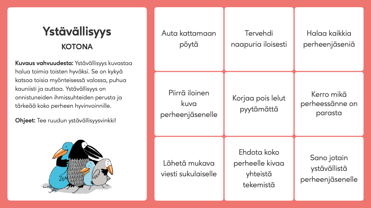 Jokaisesta vahvuudesta löytyy materiaalit myös kodin kanssa tehtävään yhteistyöhön. Näin huoltajat pääsevät mukaan tukemaan lapsen vahvuuksien kasvua ja rakentamaan vahvaa yhteyttä kodin ja koulun välille.