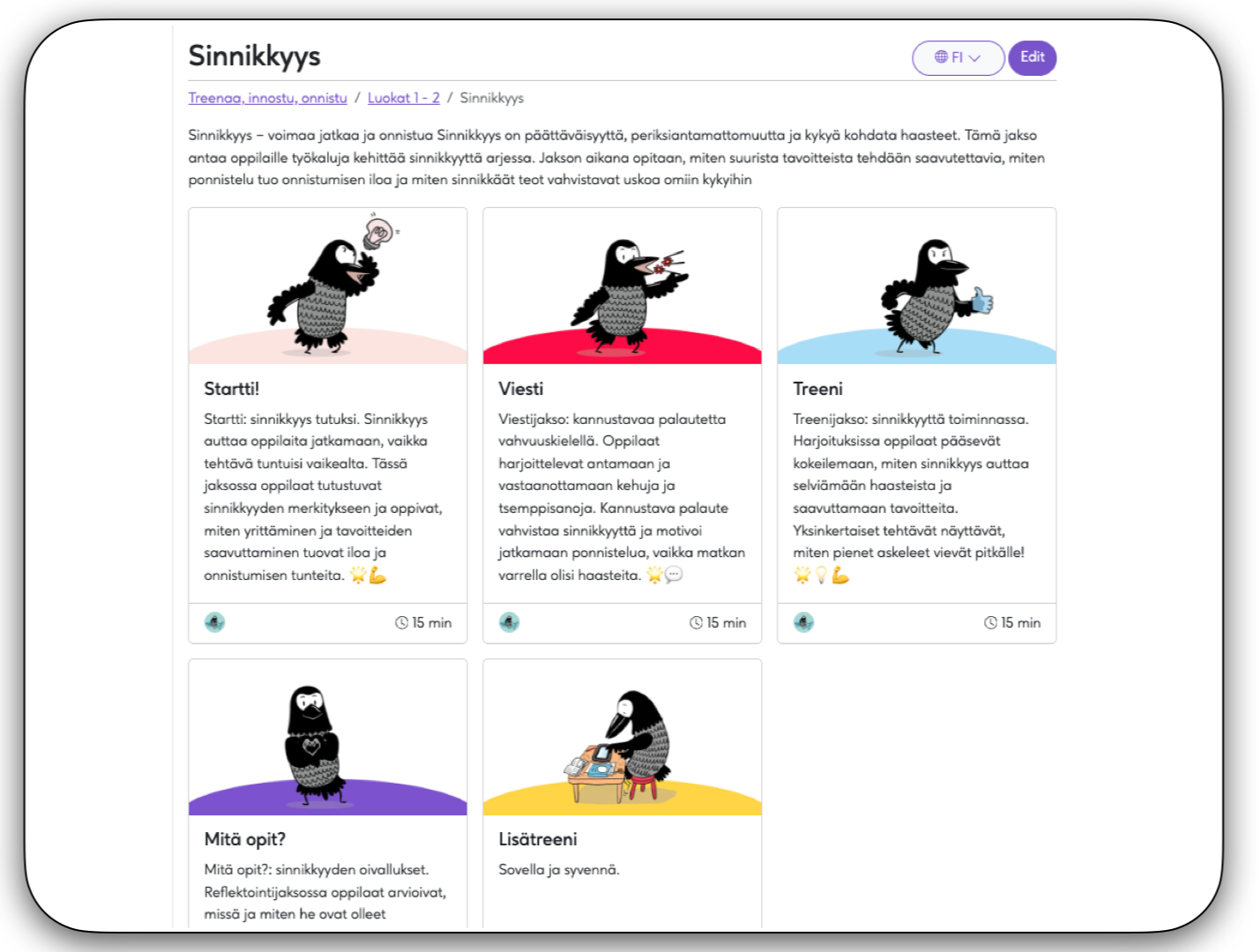 Oppiminen etenee oivaltamisesta vuorovaikutukseen ja käytännön tekoihin – ja lopuksi pysähdytään pohtimaan, mitä opittiin ja miten vahvuus näkyy omassa elämässä.