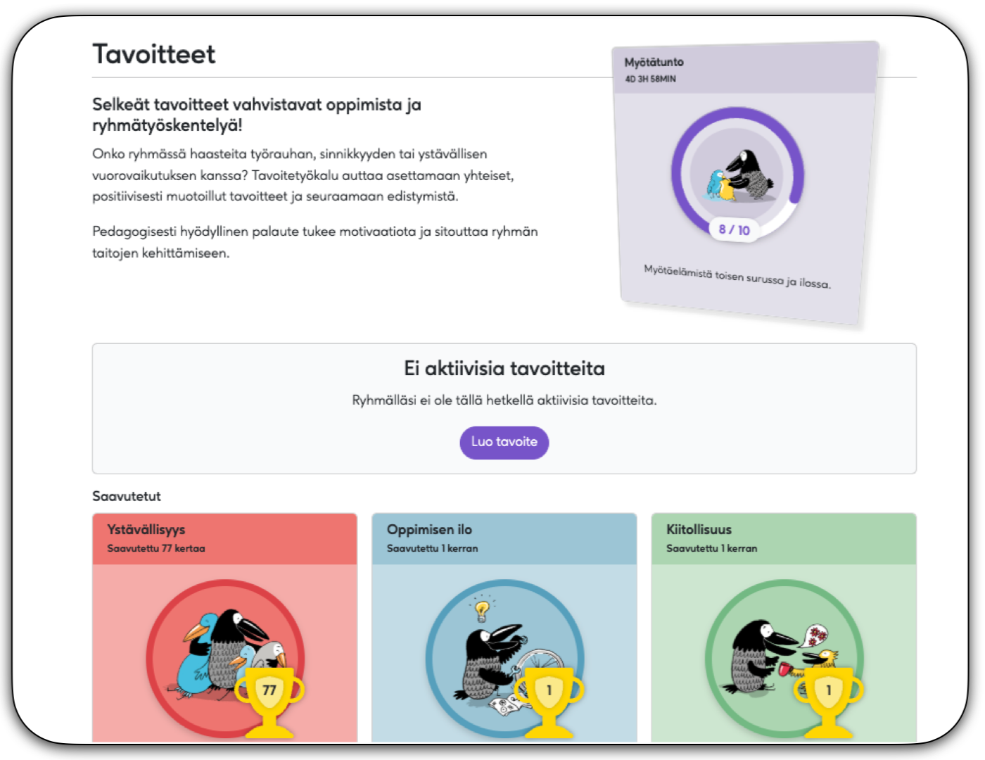Tavoitetyökalu auttaa ryhmää asettamaan yhteisiä, merkityksellisiä tavoitteita taitojen harjoitteluun. Kun suunta on yhteinen, oppiminen tuntuu innostavalta ja etenee askel askeleelta.